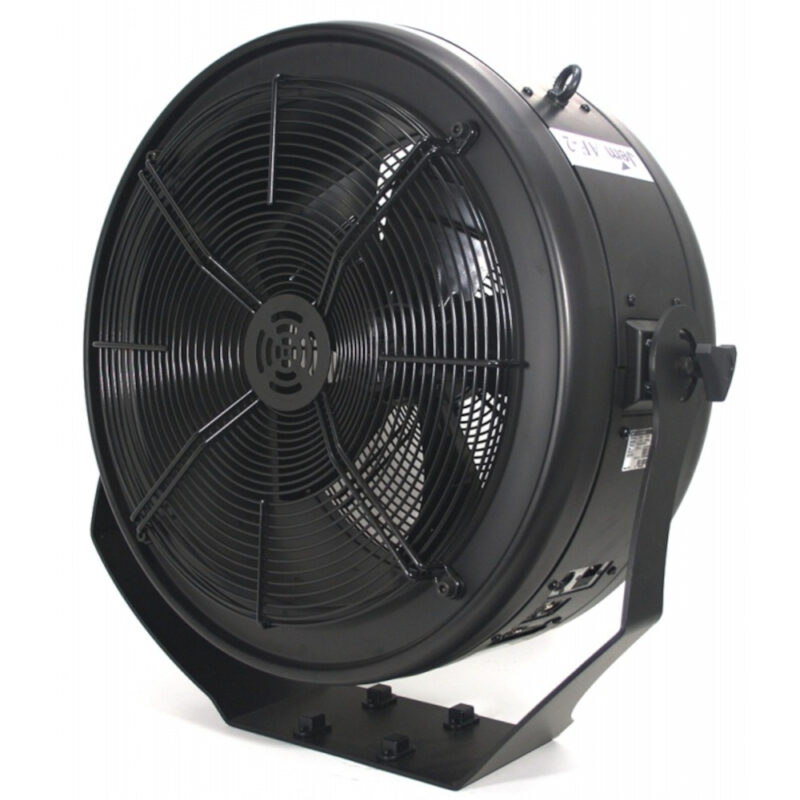 24″ Sealed motor, resists moisture • Variable speed, range and control • Instant-on, low minimum speed • Multi-functional timer remote control included • Integrated DMX • Floor standing or truss mounting • Optional “Touring Frame” • Low Noise level, only 73 dBA at maximum output • Broad regulatory compliance